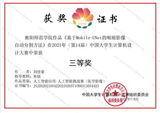 8月30日,第14届中国计算机设计大赛全国总决赛落下帷幕。亚博官网焦铬老师指导,2017级网络工程专业刘佳豪同学完成的作品《基于Mobile-UNet的喉癌影像自动分割方法》荣获全国总决赛三等奖。这是亚博官网学生首次获得该类赛事的国家级奖项。