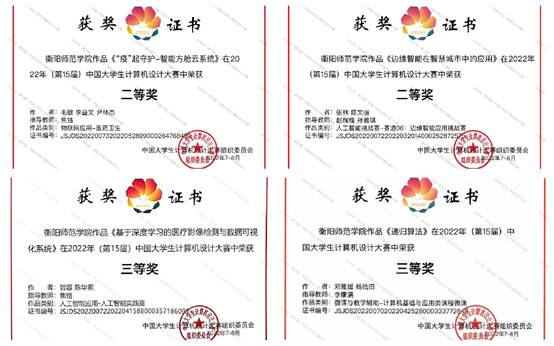 在中国大学生计算机设计大赛物联网应用类竞赛中,由焦铬教授指导的毛敏、李益文、尹林杰同学的作品《“疫”起守护-智能方舱云系统》荣获国赛二等奖;在人工智能应用类竞赛中,由赵辉煌教授、孙雅琪老师指导的张林、陈文丽同学的作品《边缘智能在智慧城市中的应用》荣获国赛二等奖,由焦铬教授指导的贺蓉、陈华索同学的作品《基于深度学习的医疗影像检测与数据可视化系统》荣获国赛三等奖;在微课与教学辅助类竞赛中,由李康满副教授指导的邓雅媛、杨皓田同学的作品《递归算法》荣获国赛三等奖。